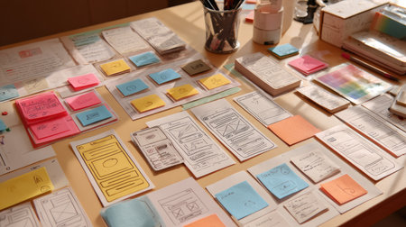 A vibrant workspace during a brainstorming session, featuring colorful sticky notes and design mockups on a wooden table. Ideal for creative processes.