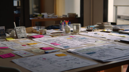 A modern workspace with various sketches, notes, and stationery items spread across a table, reflecting creativity and collaboration in design and project planning.