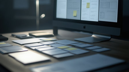 A modern workspace featuring organized notes and a computer screen showcasing a digital project management board, reflecting creativity and productivity in a professional environment.