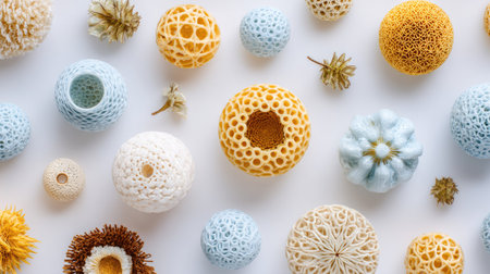 Flat-lay composition of various intricately designed, 3D-shaped objects, mostly spherical or orb-like in form, with openwork patterns. The objects are presented in a variety of pastel colors (cream, beige, light blue, and mustard yellow) against a plain white background. Dry botanical elements (seeds and leaves) are scattered among the objects, adding to the overall aesthetic of the image.