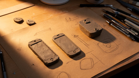 On a wooden table, clay models of smartphones are surrounded by sketches and tools. The warm light illuminates the scene, enhancing the artistic atmosphere of the workshop.