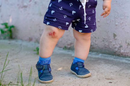 blood abrasion on his knee as a result of falling on the asphalt in a small European boy