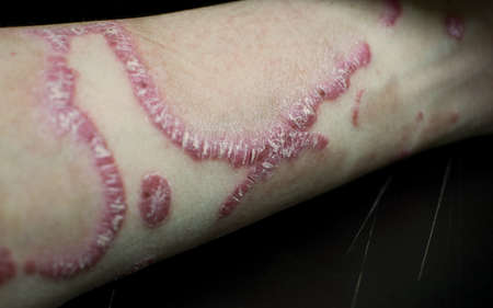 Man scratch oneself, dry flaky skin on hand with psoriasis vulgaris, eczema and other skin conditions like fungus, plaque, rash and patches. Autoimmune genetic disease.