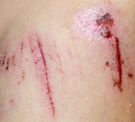 sore on the knee bruised wound on the knee, the boy fell and scratched his knee