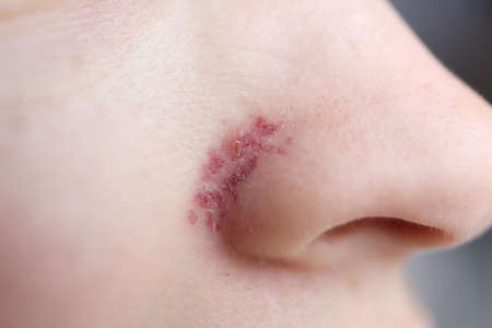 Closeup of red inflamed rash on womans nose. Allergic skin reaction concept
