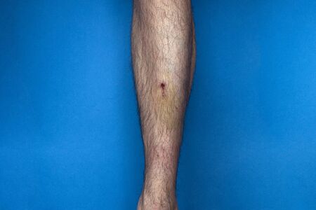 Bruised skin macro close up shot of hairy Caucasian male leg.