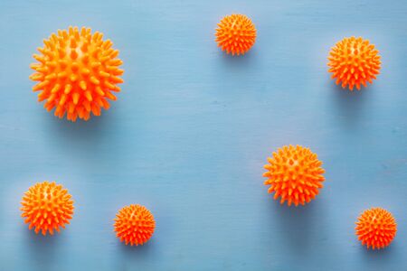 Abstract virus strain orange model of Coronavirus disease COVID-19 on blue wooden background with copy space. Virus Pandemic Protection Concept