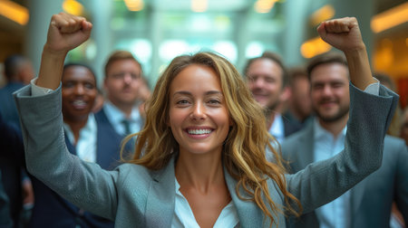 A diverse group of professional stand together in a modern office, celebrating with raised fist and smile. The atmosphere is lively and filled with positivity, showcasing teamwork and achievement.