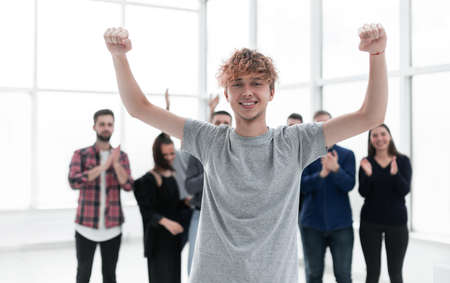 The businessman's victory. Happy manager in the office. Black man celebrating sucess. Business success in the capital.
