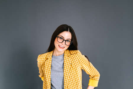 Portrait of cheerful young caucasian woman in eyeglasses and business suit on gray background looking on camera.