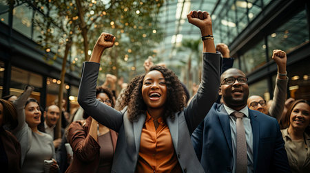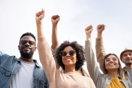 A diverse group of individuals raising their fists in celebration outdoors. They express joy and unity, showcasing a positive and empowering atmosphere. ai generated.