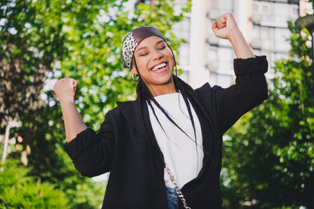 Playful stylish woman celebrates outdoors in an urban park arms raised and smiling in a chic blazer and head scarf during summer