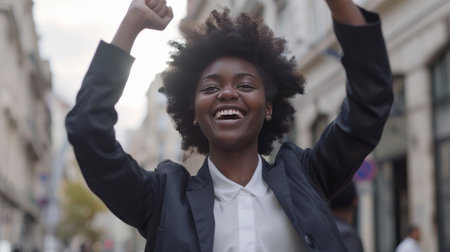 Exuberant Professional Woman Celebrates Success Arms Raised in Triumph, Joyful Expression