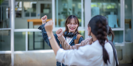 Student university friendship concept with classmate walking together at campus college park. Youth teenage and education