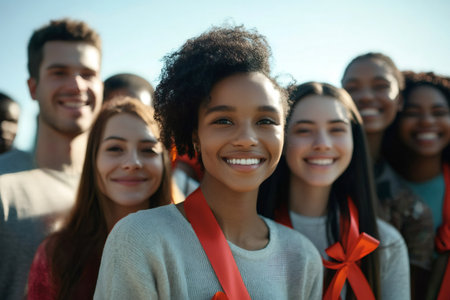 Diverse young people smiling, wearing red ribbons, symbolizing support and solidarity for a significant cause or awareness campaign