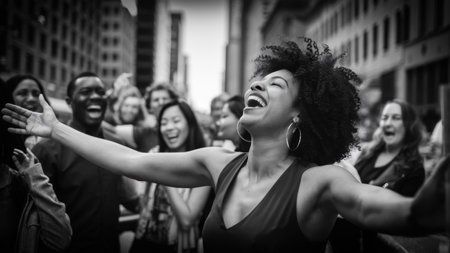 Join the vibrant Juneteenth celebration with this powerful photograph of a diverse black group raising arms in support of racial equality. The image captures the essence of unity, empowerment, and the joyous spirit of commemorating freedom and heritage.