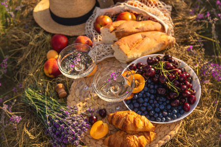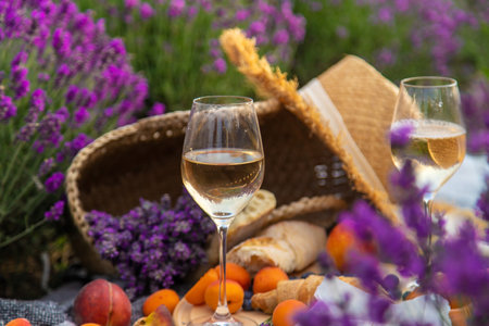 wine, fruits, berries, cheese, glasses picnic in lavender field Selective focus Nature