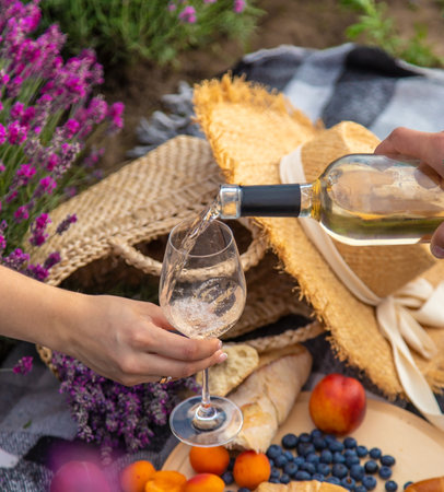 Picnic with wine in a lavender field. Selective focus. Nature.