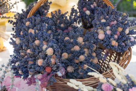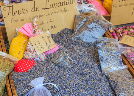 Exotic dried provencal lavender flowers for sale with a handwritten signs at a local outdoor farmers market in Nice, France