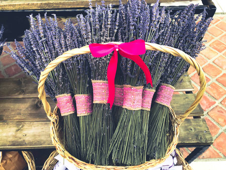 Dry lavender flowers bunch with red ribbon in a street market in Albania.