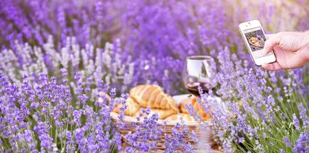 A man holds an iphone 4s in his hand and photographs still life of food and drinks in a lavender field.