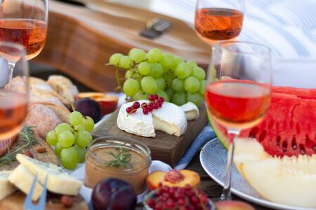 Romantic picnic scene on summer day. Outdoor picnic with wine and a fruit in the open air on the background of green grass.
