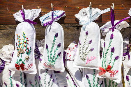 Colorful decorative sachets filled with lavender the Cours Saleya, famous market in the Old Town Vieille Ville, Nice, French Riviera, South of France