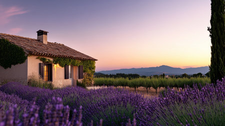 A charming French country house sits amidst lush lavender fields, with warm stucco walls reflecting the golden hues of the setting sun. Nature's beauty and tranquility abound.