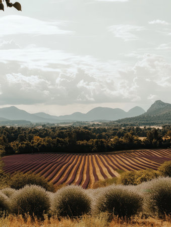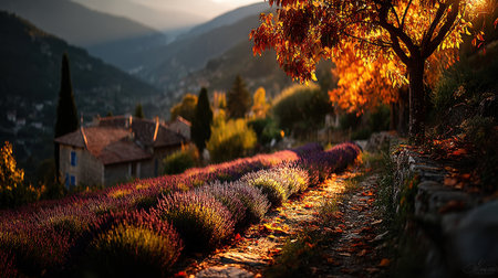 A breathtaking autumn landscape features vibrant lavender fields under golden sunlight in a tranquil French countryside. Experience nature's beauty.