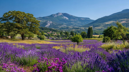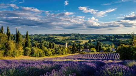 A breathtaking view of lavender fields stretching under a vibrant sky, framed by lush hills and rustic farmhouses, embodying tranquility.