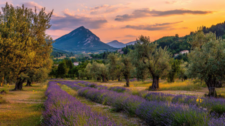 Picturesque rural scene capturing rows of vibrant purple lavender flowers cultivated between established olive trees. In the background, a prominent, rugged mountain rises against a richly colored sky displaying hues of orange and pink from the setting sun, suggesting a warm, tranquil evening in a southern European landscape.