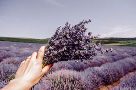Woman's hand holding a bunch of lavender flowers on the background of a lavender field.