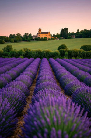 Lavender fields and distant church view