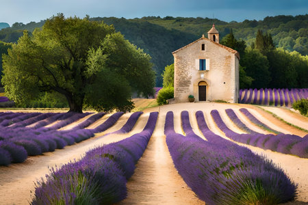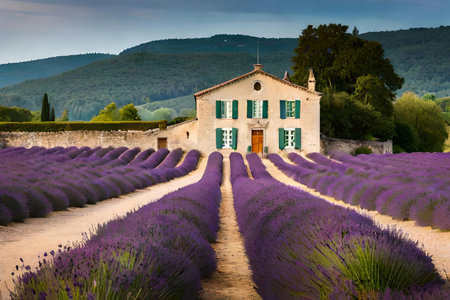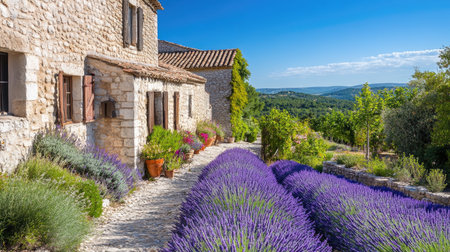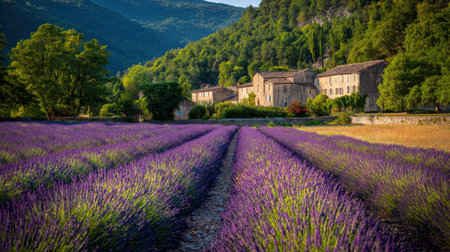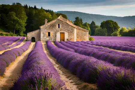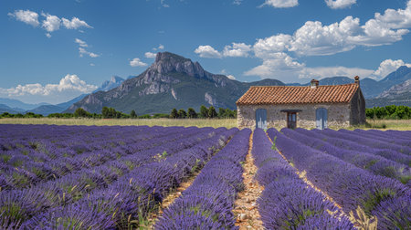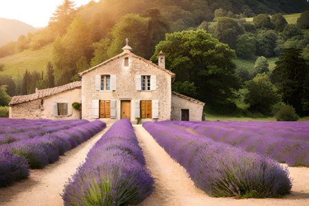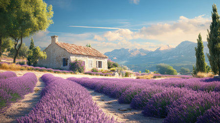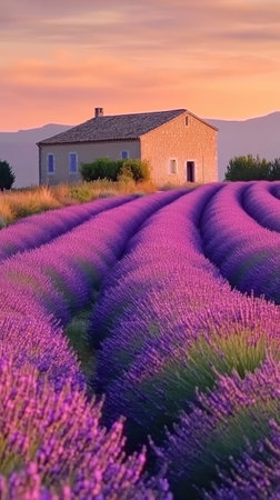 Experience the serene beauty of lavender fields embracing a rustic stone house in Provence. This vibrant landscape showcases nature's charm and tranquil atmosphere.