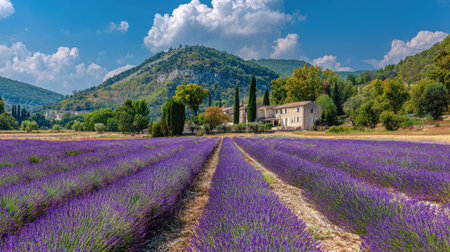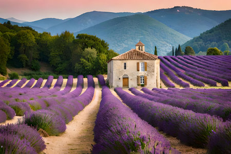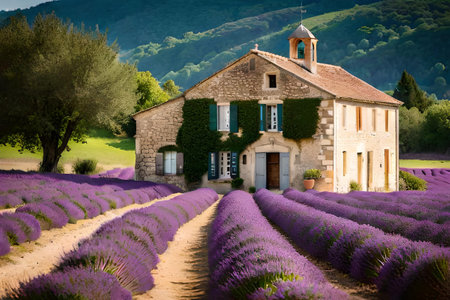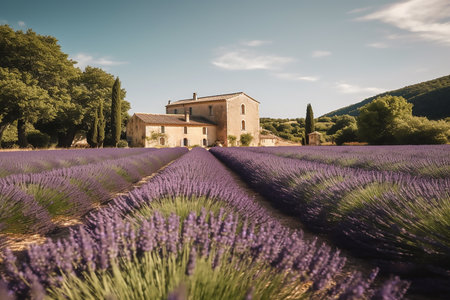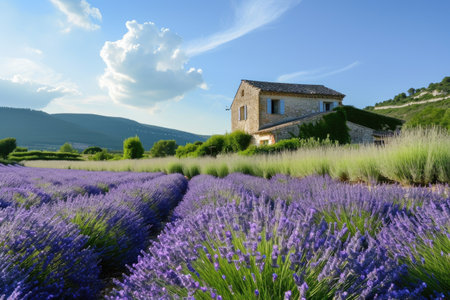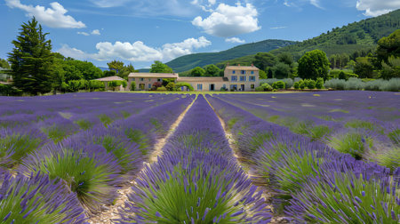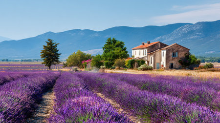 A picturesque Provence lavender field in full bloom with a traditional farmhouse AI generated