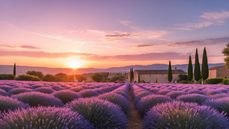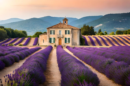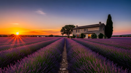 Vibrant lavender fields stretch towards a rustic stone house as the sun sets behind rolling hills in Provence. The tranquil atmosphere captures the beauty of summer.