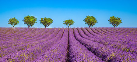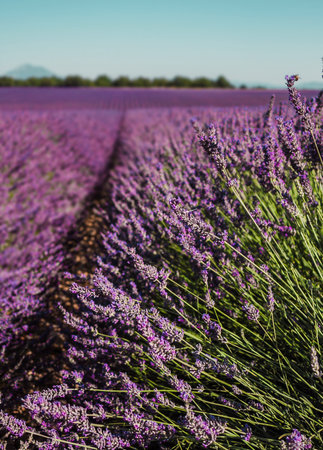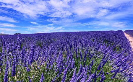 Lavender fields near Valensole, Provence, France. Beautiful summer landscape. Selective focus. Blooming lavender flowers. Famous travel destination.