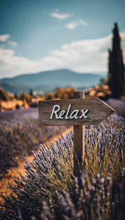 An image captures a wooden sign directing towards the word Relax set in a field. The scene showcases a path edged by lavender with a mountain range background. The composition features soft lighting with a slightly blurred focus. It may be suitable for relaxation, travel, or wellness related content.
