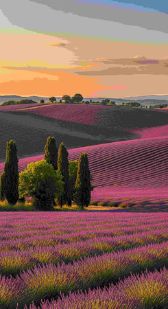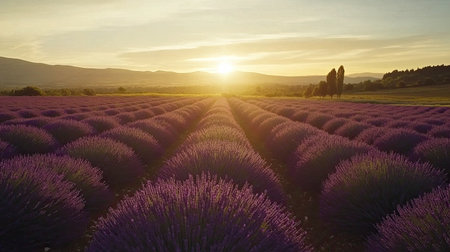 Endless rows of purple lavender under golden sunset, rolling hills, French countryside.