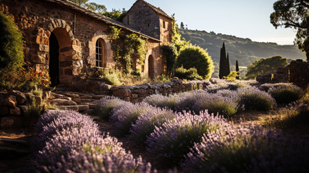 Beautiful view of an old house in Provence on a bright sunny day with a lavender field in the foreground. Generative AI