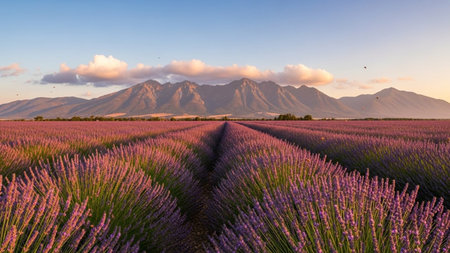 Endless rows of vibrant purple lavender flowers extend towards a majestic mountain range under a soft sunset sky with scattered clouds.