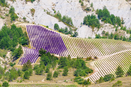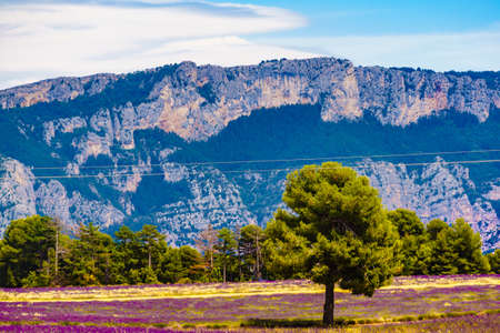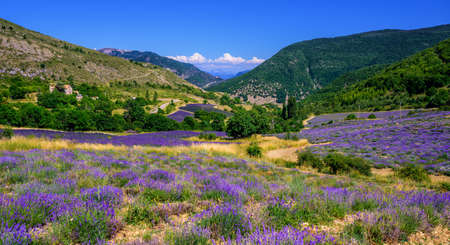 Lavender field on mountain hill in harvest time. Rural landscape in Baronnies Provencales Regional Nature Park in France.