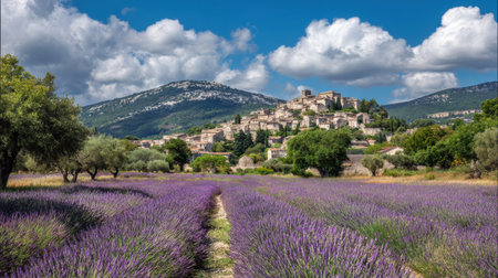 A breathtaking view of lavender fields stretching under a vibrant sky, framed by lush hills and rustic farmhouses, embodying tranquility.