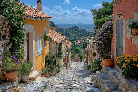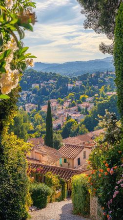 The sun casts a warm glow over a beautiful village nestled in the hills of Provence, with vibrant flowers bordering a winding pathway leading to stunning vistas.