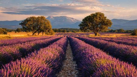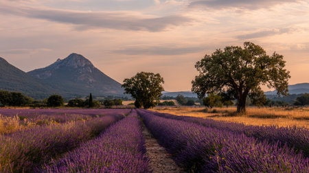 Experience the tranquil beauty of a lavender field at sunset, showcasing vibrant purple flowers with majestic mountains in the background. Ideal for nature lovers.