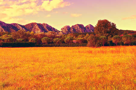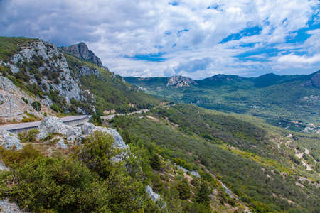 Dramatic sunset in the mountain valley. Cloudy sky with strong wind in Provence, France