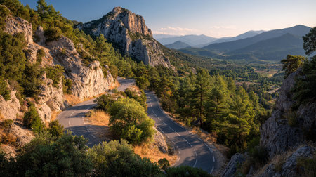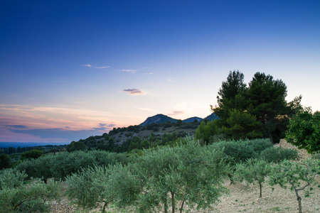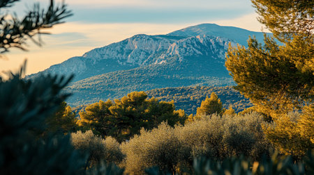 A breathtaking view of a mountain towering over an olive grove, surrounded by lush greenery. Ideal for nature enthusiasts and landscape lovers.