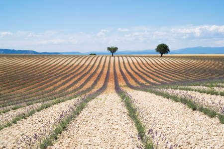 Beautiful landscape of blooming lavender field with sunny sky, lonely trees uphill on horizon. Provence, France, Europe.