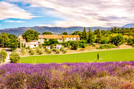 old stone house in Lavender field in Provence, south of France. Lavender flowers blooming at sunset.