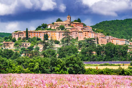Very beautiful and colorful houses in the small French village of Roussillon, famous for its ochre rocks. France, Provence, Luberon.